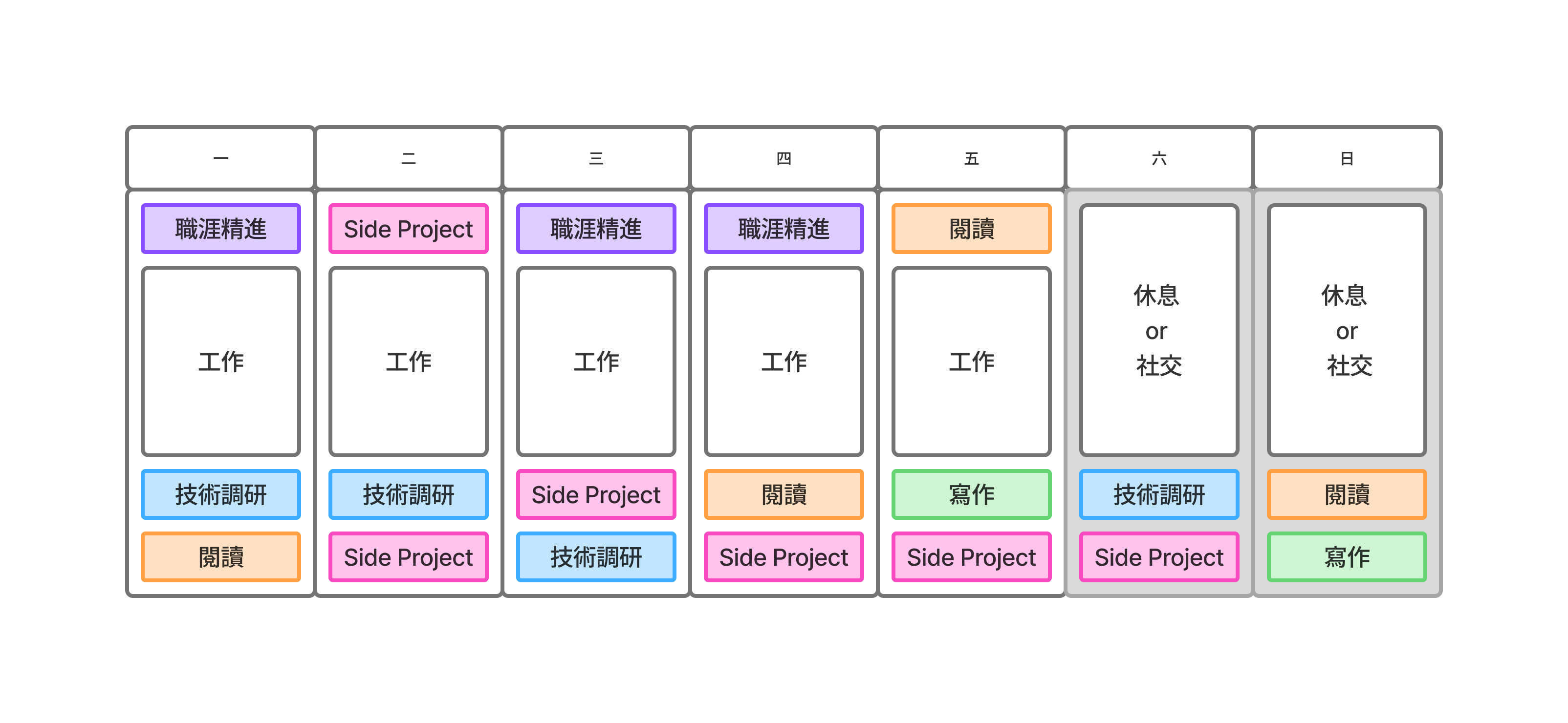 在我原本的生活中,我常常像在拋接雜耍球一樣,同時在 4 ~ 5 個任務之間維持動態平衡。這些任務可能包括 Side project 開發、技術調研、職涯精進、閱讀與運動。